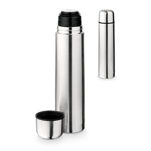 Descrição: Garrafa em aço inox de parede dupla térmica, isolada a vácuo. A tampa interior possui sistema de botão abre e fecha dando maior isolamento e segurança contra vazamentos. O design da tampa vira um copo para que possa consumir a sua bebida preferida. Capacidade até 1L. Preserva as bebidas quentes por 12h e frias por 24h. Fornecida em caixa presente. Certificação EU Food Grade. ø82 x 330 mm