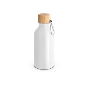 Descrição: Squeeze em alumínio 100% reciclado com cor sólida brilhante. A squeeze tem uma tampa em bambu, à prova de água, e mosquetão que facilita o transporte. Capacidade até 400 mL. Certificação EU Food Grade. A cor e o resultado da impressão nos materiais naturais pode variar entre produtos. ø66 x 171 mm