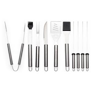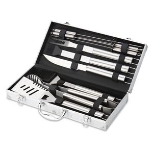 Descrição: Kit churrasco 10 peças em maleta de alumínio com travas de segurança e placa central para personalização. Contém: espátula, pegador, escova para grelha, faca, pincel, garfo e quatro espetos, parte interna da maleta com revestimento em TNT e suportes de velcro para fixação das peças. Largura 7,6 cm Medidas aproximadas para gravação(CxL): 4,5 cm x 6,3 cm Peso aproximado(g): 2195 Comprimento 42,7 cm Altura 21,5 cm