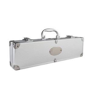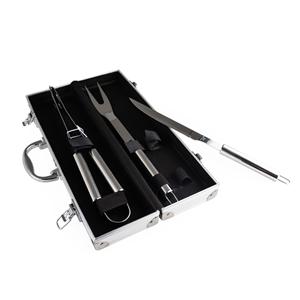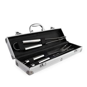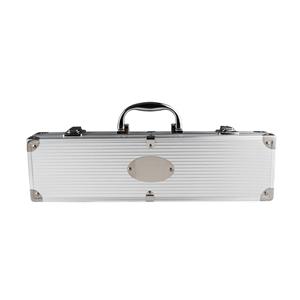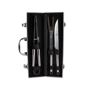 Descrição: Kit de churrasco com três peças em aço inox. O conjunto inclui uma pinça, um garfo e uma faca de seis polegadas. Acompanha maleta de alumínio com placa para personalização. Medidas aproximadas para gravação(CxL): 4 cm x 5 cm Peso aproximado(g): 677 Profundidade 5,8 cm Comprimento 36,7 cm Altura 11,4 cm