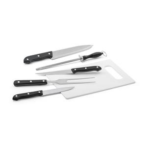Descrição: Kit churrasco em estojo de nylon 210D. Composto por tábua em PP e 5 utensílios em aço inox e PP: faca chefe, faca boning, faca pequena, garfo e afiador. Próprio para contato com alimento.