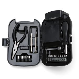 Descrição: Kit ferramenta 19 peças de maleta plástica com lanterna. Necessário 4 pilhas AA para utilizar lanterna, possui botão para ligar/desligar lanterna na alça e trava lateral no estojo. Contém: conjunto 10 pontas(4 chaves phillips, 2 chaves fenda, 3 chaves torx e um adaptador), chave canhão, adaptador chave de boca, mini chave de fenda, mini chave phillips, 4 extensores bocais(7MM, 8MM, 9MM e 10MM) e alicate. Largura 12,7 cm Medidas aproximadas para gravação(CxL): 6 cm x 2,5 cm Peso aproximado(g): 510 Comprimento 19,7 cm Altura 9,4 cm