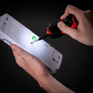 Descrição: Kit ferramenta retrátil com 7 chaves e lanterna de 6 Leds. Material plástico, possui 3 chaves Philips; 3 chaves de fenda; chave de ponta dupla sendo um mini Philips e uma mini Fenda em cada extremidade, basta desrosquear as tampas para visualizá-las. Clip vermelho com setas explicativas para abertura do compartimento de pilhas, pressione a localização da seta superior e empurre ao mesmo tempo a parte inferior para remoção, necessita de 3 pilhas AAA(não acompanha). Largura 4,1 cm Medidas aproximadas para gravação(CxL): 1,4 cm x 4,8 cm Peso aproximado(g): 172 Altura 12,1 cm