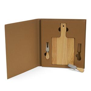 Descrição: Kit queijo 3 peças em estojo kraft, contém: Tábua de bambu retangular, faca reta, e garfo. Tábua com orifício para encaixe. Largura 31 cm Medidas aproximadas para gravação(CxL): 34 cm x 29 cm Peso aproximado(g): 1030 Espessura 2,9 cm Altura 35 cm