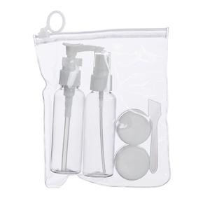 Descrição: Kit viagem 5 peças em estojo ziplock. Contém frasco de 70ml com tampa spray; frasco de 70 ml com tampa pump; 2 potes de 10ml com tampa rosqueável e mini espátula fosca. Frascos plásticos e estojo em pvc com puxador plástico. Largura 14,5 cm Medidas aproximadas para gravação(CxL): 16 cm x 13,8 cm Peso aproximado(g): 61 Altura 17,2 cm
