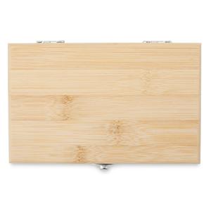 Descrição: O kit vinho com 3 peças com estojo de bambu é a escolha perfeita para quem busca elegância e funcionalidade. Acompanha um Saca-Rolhas metálico com acabamento em bambu, que possui lâmina de corte e abridor de garrafa, uma tampa de bico com detalhe em bambu e silicone, e um wine collar. A caixa de bambu tem um design sofisticado e rústico, e contém ainda um berço de espuma interno, garantindo a proteção dos itens. Largura 10,6 cm Medidas aproximadas para gravação(CxL): 10 cm x 7 cm Peso aproximado(g): 306 Comprimento 16 cm Espessura 5,1 cm