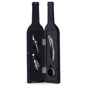 Descrição: Kit vinho formato garrafa com 4 peças: tampa de bico, bico condutor com tampa, Saca-Rolhas metálico com lâmina de corte e abridor de garrafa e wine collar. Estojo com fechamento imantado e área interna com berço de espuma. Largura 7,2 cm Medidas aproximadas para gravação(CxL): 6 cm x 19,5 cm Peso aproximado(g): 352 Altura 32,4 cm