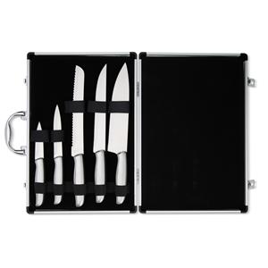 Descrição: A solução ideal para quem valoriza qualidade nos cortes e organização na cozinha. O kit inclui 5 facas em aço inoxidável, com diferentes tamanhos, perfeitas para uma experiência gourmet. Acompanha uma maleta de alumínio texturizado, com interior revestido de veludo e duas travas que garantem maior segurança. Além disso, a maleta oferece espaço para personalização, tornando o kit ainda mais exclusivo. Largura 26,2 cm Medidas aproximadas para gravação(CxL): 3,5 cm 5,5 cm Peso aproximado(g): 1161 Profundidade 3,2 cm Comprimento 35,9 cm