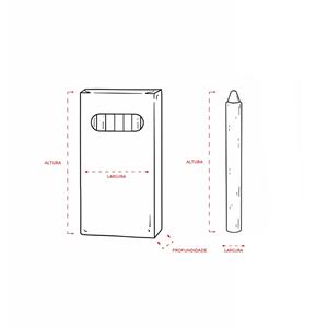 Descrição: Kit de giz de cera com seis cores. Acompanha embalagem em papel kraft. Largura 5,4 cm Medidas aproximadas para gravação(CxL): 5 cm x 4 cm (embalagem do kit) Peso aproximado(g): 28 Tamanho total aproximado (CxL): Giz: 8,6 cm x 0,8 cm Profundidade 0,9 cm Altura 9,3 cm