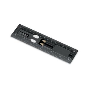 Descrição: Kit de escrita em PS. Incluso régua de 15 cm, 2 mini lápis, 1 borracha e 1 apontador. Produto certificado de acordo com a portaria Inmetro nº423 de 8/out/2021. Régua: 157 x 42 x 15 mm
