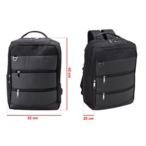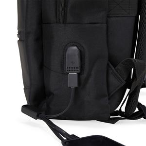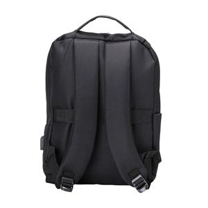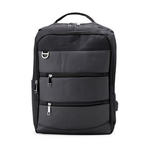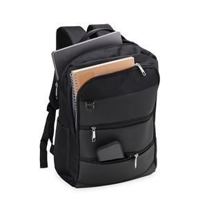 Descrição: Mochila de nylon 23 Litros com detalhes em couro sintético e quatro compartimentos, sendo o principal com bolso para notebook 15,6. Com divisórias internas para acessórios, a mochila possui bolso lateral, suporte externo USB e alça para engate em malas de viagem. Largura 33 cm Medidas aproximadas para gravação(CxL): 7,5 cm x 25 cm Peso aproximado(g): 646 Profundidade 12 cm Altura 39 cm