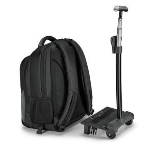 Descrição: Mochila trolley para notebook em Nylon 999 impermeável com 2 rodas com sistema de proteção integrado. Possui um compartimento principal almofadado para notebook até 17’’, um compartimento forrado e diversos bolsos. Bolso frontal com zíper e bolsos laterais em tela mesh. Trolley com pega extensível em alumínio com mola (altura da pega estendida até 550 mm), sendo a estrutura removível. Placa metálica removível com imã para fácil gravação. Capacidade até 30 L e peso de 1,70 kg. 350 x 460 x 225 mm | Placa: 50 x 20 mm