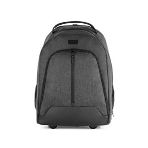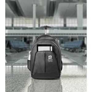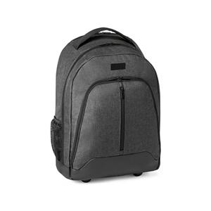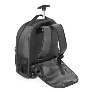 Descrição: Mochila trolley para notebook em 600D de alta densidade e poliéster 600D impermeável. Compartimento principal para notebook até 15.6''. Bolso frontal com zíper e bolsos laterais com tela. Mochila trolley com protetor de rodas e pega extensível em metal. Parte posterior e alças almofadadas. Incluso placa metálica removível com imã, para fácil gravação.
