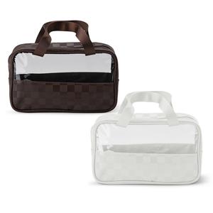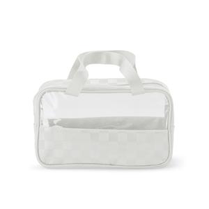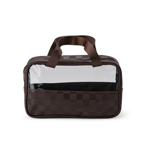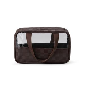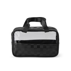 Descrição: Nécessaire em PVC e couro sintético impermeável em formato xadrez e fechamento em zíper. Possui visor transparente e duas alças de mão em nylon. Largura 25,5 cm Medidas aproximadas para gravação(CxL): 7 cm x 23 cm Peso aproximado(g): 146 Profundidade 10 cm Altura 16 cm