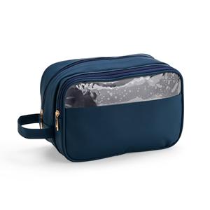 Descrição: Nécessaire confeccionada em filme sintético de poliuretano impermeável. Possui dois bolsos no compartimento interno principal, sendo um com fechamento em zíper e outro em tela de nylon. Dispõe ainda de compartimento frontal com viseira e revestimento interno em PVC, ideal para guardar itens molhados. Largura 25 cm Medidas aproximadas para gravação(CxL): 9 cm x 23 cm Peso aproximado(g): 229 Profundidade 10 cm Altura 16 cm