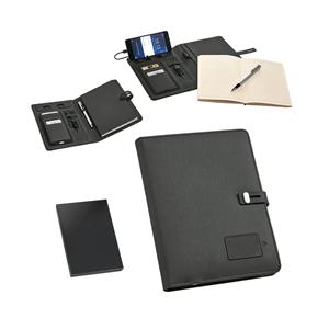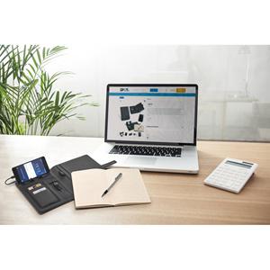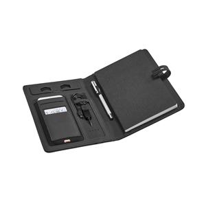 Descrição: Pasta A5 em Couro Sintético com bateria portátil embutida (lítio). A bateria tem capacidade para 4.000 mAh, tempo de vida ≥ 500 ciclos com entrada/saída 5V/1A e cabo USB-C para carregar a bateria. No interior, contém um caderno removível com 128 páginas pautadas de cor marfim, um suporte para esferográfica (não inclusa), elásticos para organização e suporte para smartphone. No exterior, uma placa com acabamento emborrachado, LED interior e botão on/off. Fornecida em caixa presente. 165 x 225 x 25 mm | Placa: 55 x 35 mm | Caixa: 180 x 240 x 35 mm