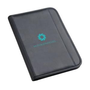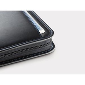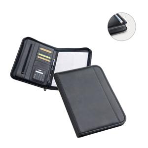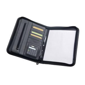 Descrição: Pasta A4 em Couro Sintético, com bolso frontal e fecho. O interior contém um bloco de 40 páginas pautadas, suporte para esferográfica (não inclusa), vários bolsos e calculadora dual-power de 8 dígitos, com pilha LR1130 inclusa. 250 x 345 x 20 mm