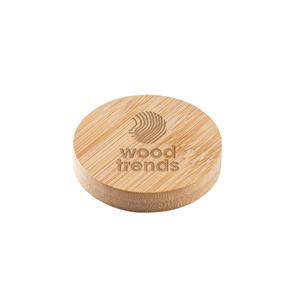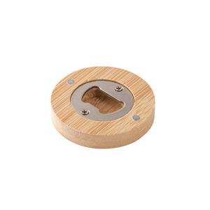 Descrição: Porta-Copos em bambu com abridor e imã para fixar em superfícies. A cor e o resultado da impressão nos materiais naturais pode variar entre produtos. Ø65 x 11 mm