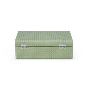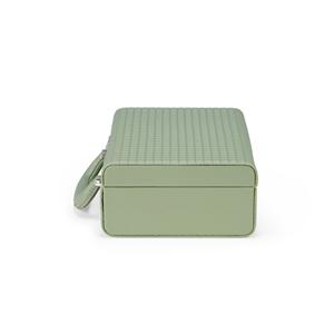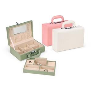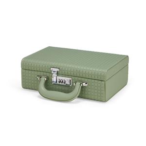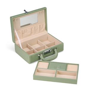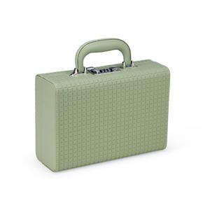 Descrição: Maleta porta-joias em couro sintético texturizado, revestimento interno aveludado e fechamento por cadeado com senha numérica. Possui quatro ganchos, bolso com elástico e espelho retangular fixado. Conta ainda com dois compartimentos principais: o superior, removível, com cinco divisórias, uma com tampa e duas almofadadas para anéis; e o inferior, com seis divisórias removíveis. Largura 27 cm Medidas aproximadas para gravação(CxL): 14 cm x 24 cm Peso aproximado(g): 1290 Profundidade 9 cm Altura 20 cm