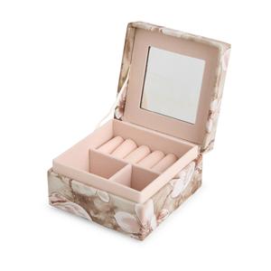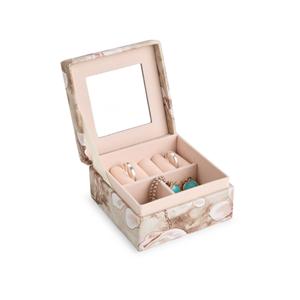 Descrição: Porta-joias em couro sintético levemente texturizado e revestimento interno em veludo. Conta com espelho fixo no interior da tampa e um compartimento com três divisórias, uma delas com almofadas para anéis e brincos. Largura 9,2 cm Peso aproximado(g): 107 Profundidade 9 cm Altura 5 cm