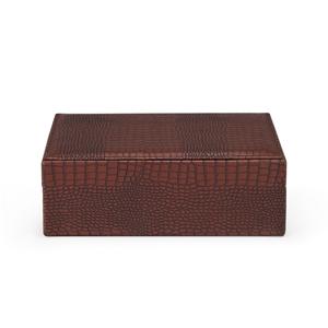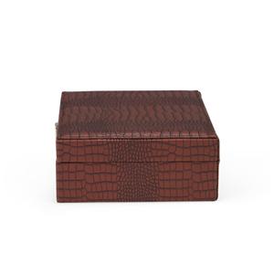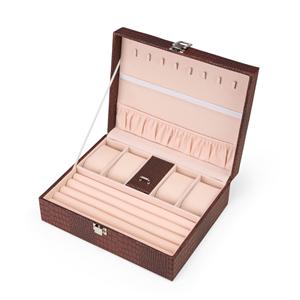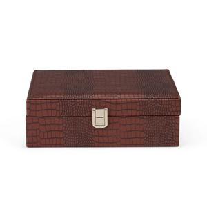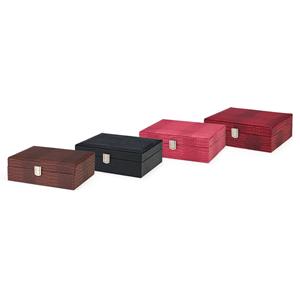 Descrição: Porta-joias em couro sintético com textura crocodilo, trava de segurança para fechamento do estojo e revestimento interno aveludado. Possui oito ganchos e um bolso com elástico no interior da tampa, além de compartimento principal com seis divisórias: quatro com almofadas removíveis para relógios, uma com tampa e puxador metálico e outra com almofadas fixas para anéis e brincos. Largura 24 cm Medidas aproximadas para gravação(CxL): 16 cm x 22 cm Peso aproximado(g): 681 Profundidade 18 cm Altura 8 cm