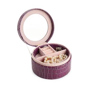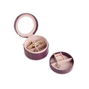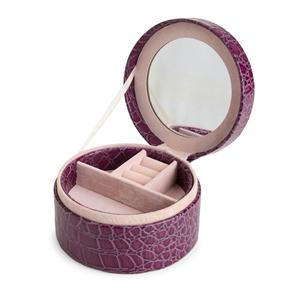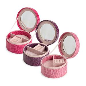 Descrição: Porta-Joias em couro sintético com textura de crocodilo e formato arredondado. Conta com espelho no interior da tampa, além de dois compartimentos principais: o superior, removível, com quatro divisórias em diferentes tamanhos, uma delas com almofadas para abrigar anéis e brincos; e o inferior, com mais quatro divisórias. Largura 12,5 cm Medidas aproximadas para gravação(CxL): 8 cm x 8 cm Peso aproximado(g): 210 Circunferência 39,5 cm Altura 7 cm