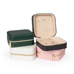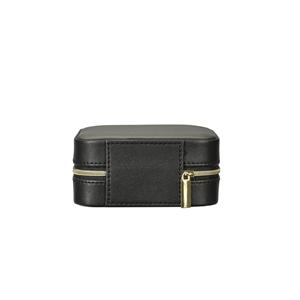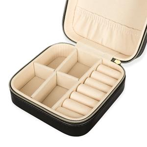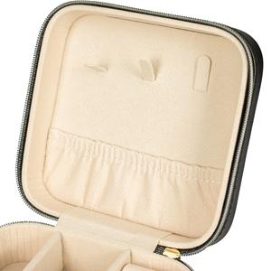 Descrição: Porta-joias feita em couro sintético com revestimento aveludado e fechamento em zíper. Possui três ganchos pequenos e um bolso com elástico na parte interna da tampa, além de divisória removível com quatro compartimentos e um espaço estofado com ranhuras, ideal para organizar brincos e anéis. Largura 12 cm Medidas aproximadas para gravação(CxL): 11 cm x 11 cm Peso aproximado(g): 134 Comprimento 11,9 cm Altura 5,5 cm
