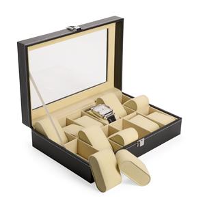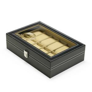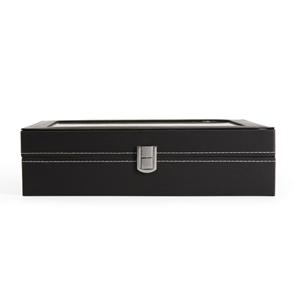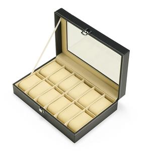 Descrição: Porta-relógios com acabamento em couro sintético à base de PVC e revestimento interno em veludo. Conta com 12 compartimentos fixos com almofadas removíveis em espuma, além de visor feito em vidro e trava de segurança para fechamento do estojo. Medidas aproximadas para gravação(CxL): 2 cm x 25 cm Peso aproximado(g): 1015 Profundidade 20,3 cm Comprimento 30,3 cm Altura 8 cm