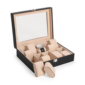 Descrição: Porta-relógios com acabamento texturizado em couro sintético à base de PVC e revestimento interno em tecido aveludado. Possui dez divisórias com almofadas removíveis, visor de vidro e trava de segurança na tampa. Largura 20,5 cm Medidas aproximadas para gravação(CxL): 2 cm x 24 cm Peso aproximado(g): 851 Comprimento 25,7 cm Altura 8 cm