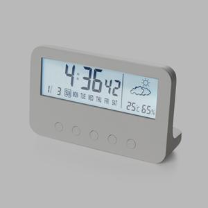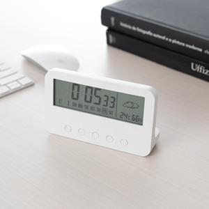 Descrição: Relógio digital com alarme. Produzido em plástico, o relógio possui um display LCD com exibição das horas, dias da semana, data, alarme, relógio de contagem progressiva e regressiva, temperatura, clima e umidade, parte frontal inferior com botões para ajustes, e parte traseira com compartimento para 2 pilhas AAA (não acompanha). Acompanha manual de instruções em inglês Largura 13,5 cm Medidas aproximadas para gravação(CxL): 2 cm x 10,1 cm Peso aproximado(g): 136 Altura 8,2 cm
