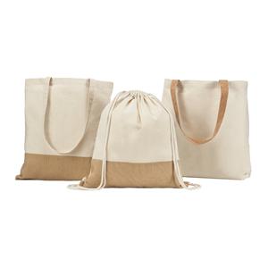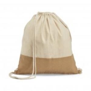 Descrição: Sacola tipo mochila 100% algodão (160 g/m²) com detalhe em imitação de juta e alça em algodão. 370 x 410 mm