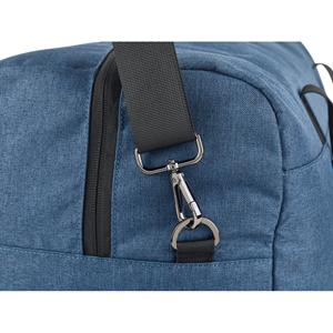 Descrição: A Motion Bag é uma sacola de viagem prática e elegante, em 600D catiónico e Couro Sintético de alta qualidade. O compartimento principal espaçoso é ideal para guardar roupa e outros utilitários necessários para viagens curtas. Possui ainda quatro bolsos no interior e bolso frontal com uma pala de desenho assimétrico, que caracteriza esta linha e lhe confere um design moderno. Fecha com ímã. A praticidade desta sacola é acompanhada por um design pormenorizado e cuidado que conduzem a detalhes como o espaço para colocar a etiqueta de nome, os pés metálicos que protegem a sacola, o desenho do fecho que permite ser controlado por cadeado (não incluso). As alças são desenhadas para serem ajustáveis e confortáveis. Fornecida em sacola de TNT. 500 x 300 x 250 mm | Sacola em TNT: 700 x 450 x 75 mm