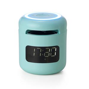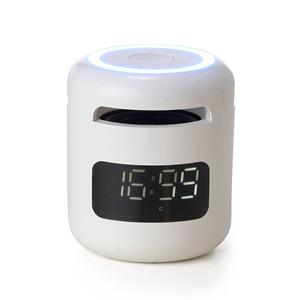Descrição: Caixa de som multimidia com estrutura em plástico, display frontal em LED e base emborrachada antiderrapante. Possui conexão Bluetooth 5.0 e entradas para cabo auxiliar P2 e cartão TF (microSD), que permitem a reprodução de arquivos MP3, além de função para sintonia de rádio FM e programação de até três alarmes diferentes. Acompanha cabo USB-C. Largura 7,5 cm Medidas aproximadas para gravação(CxL): 1,5 cm x 5 cm Peso aproximado(g): 248 Circunferência 24 cm Altura 8,8 cm