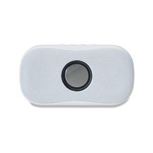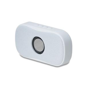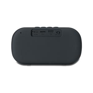 Descrição: Caixa de som multimídia sem fio com estrutura em plástico com acabamento frontal em malha. Possui painel superior de botões que permite controlar os modos Bluetooth 5.0 e rádio FM, além de permitir o atendimento de dispositivos pareados. Conta ainda com entradas para cartão microSD e USB-A para a reprodução de arquivos MP3, carregamento via cabo micro-USB, plaquinha metálica fixa na área frontal e base com borrachas antiderrapantes. Acompanha cabo micro-USB. Largura 16,7 cm Medidas aproximadas para gravação(CxL): 3 cm x 3 cm Peso aproximado(g): 335 Espessura 7cm Altura 8,9 cm