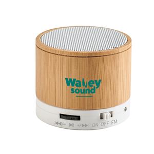 Descrição: Caixa de som com microfone em bambu. transmissão sem fios BT v3.0, ligação stereo 3,5 mm e leitor de cartões TF e potência de 3W (4Ω). Bateria com capacidade até 300 mAh e autonomia aproximada de 3 horas. Função para atender chamadas, controle de volume, conexão à playlist do dispositivo móvel e rádio FM. Incluso cabo USB / micro USB para carregar e cabo de áudio (Jack/Jack). Fornecida em caixa presente de papel kraft. ø60 x 52 mm