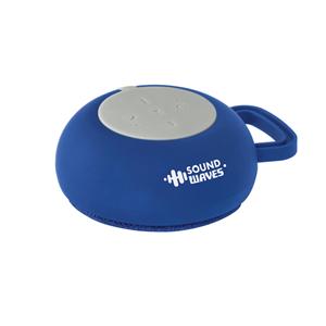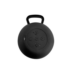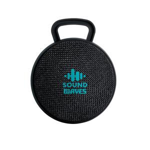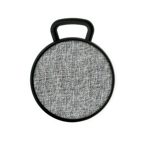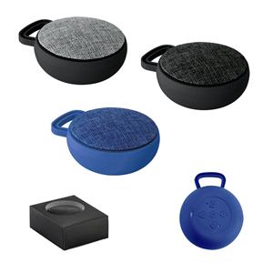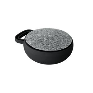Descrição: Caixa de som com microfone em ABS e tecido em poliéster. com gancho e acabamento emborrachado. Transmissão por bluetooth, potência de 3W/4Ω e autonomia até 3 h. Função para atender chamadas, controle de volume e conexão à playlist do dispositivo móvel. Incluso cabo para carregamento. Fornecida em caixa presente. ø90 x 40 mm | Caixa: 115 x 95 x 45 mm