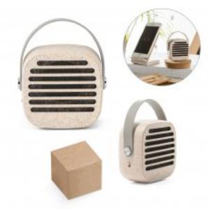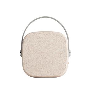 Descrição: Caixa de som portátil em fibra de palha de trigo e ABS com alça em silicone para facilitar o transporte, potência de 3W e transmissão por bluetooth 5.0. Tempo de reprodução de 4h30, com uma bateria de 500 mAh. Incluso cabo micro USB. Fornecido em caixa presente de papel craft.