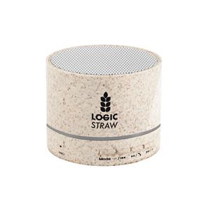 Descrição: Caixa de som portátil com microfone, em fibra de palha de trigo e ABS 100% reciclado, com transmissão sem fios BT 5.3. Tem potência de 3W, bateria com 400 mAh e autonomia, aproximada, de 4h30. Permite ainda as funções de atender chamadas, leitor de cartões microSD, entrada AUX e reprodução automática via porta USB-A. Incluso cabo de carregamento USB. Fornecido em caixa presente de papel kraft reciclado que pode ser reutilizada como suporte de celular. A grelha é fornecida solta para pedidos não personalizados. A cor e o resultado da impressão nos materiais naturais pode variar entre produtos. ø62 x 48 mm