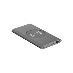 Descrição: Bateria portátil com carregador por indução (wireless) em alumínio 100% reciclado. Bateria de polímero de lítio com capacidade de 4.000 mAh e tempo de vida de ≥ 500 ciclos. Com LED indicador de carga, uma porta de entrada USB-C, uma porta de saída USB-A e potência de carregamento sem fios de 5W. Incluso cabo USB-C para carregar a bateria. Fornecida em caixa presente de papel kraft reciclado. Cor 104 e 127: fornecidas em caixa presente preta com janela 123 x 70 x 10 mm