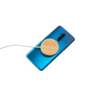 Descrição: Carregador magnético por indução (wireless) super-rápido em bambu. Potência de carregamento super-rápido de 15W. Incluso cabo de carregamento USB-C de 1 metro. Compatível com dispositivos móveis com tecnologia de carregamento sem fios. Fornecido em caixa presente de papel kraft reciclado. A cor e o resultado da impressão nos materiais naturais pode variar entre produtos. Ø59 x 8 mm