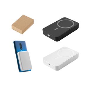 Descrição: Bateria portátil magnética com carregador por indução (wireless) em ABS 100% reciclado. Tem capacidade de 10.000 mAh e tempo de vida ≥ 300 ciclos. Esta bateria portátil torna-se muito prática para o dia a dia, uma vez que permite, através do seu magnetismo, prender-se atrás dos dispositivos móveis. Incluso grip magnético extra para ser colocado nos smartphones que não têm magnetismo. Possui entrada/saída USB-C e potência máxima de 15W para carregamento rápido sem fios. Compatível com smartphones com tecnologia de carregamento sem fios. Incluso cabo USB-C para carregamento rápido. Fornecido em caixa presente de papel kraft reciclado. 100 x 64 x 18 mm | Caixa: 90 x 22 x 103 mm
