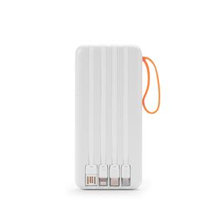 Descrição: Power bank feito em plástico, possui capacidade de 10.000mAh, painel de LED com números fixos para visualização do percentual de bateria do carregador portátil e alça lateral emborrachada para transporte. Apresenta quatro cabos acoplados: USB-C, Micro USB, Lightning e Cabo USB. Dispõe ainda de duas saídas USB e uma USB-C para recarga do próprio dispositivo. Largura 6,5 cm Medidas aproximadas para gravação(CxL): 5 cm x 5 cm (power bank) - 14 cm x 8 cm (caixa) Peso aproximado(g): 243 Comprimento 14,5 cm Espessura 2 cm