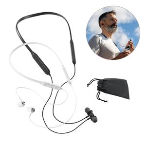 Descrição: Fone de ouvido em PC. Transmissão sem fios BT v5.0 com banda para pescoço com autonomia aproximada de 7 horas. Função para atender chamadas, controle de volume e conexão à playlist do dispositivo móvel. Incluso cabo USB / micro USB para carregar. Fornecido em bolsa em TNT. 190 x 200 mm