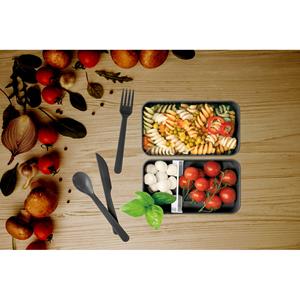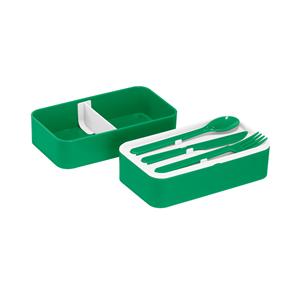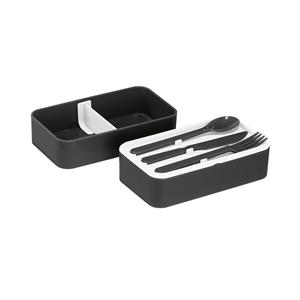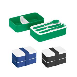 Descrição: Marmita em PP e PS com 2 compartimentos (680 mL cada) e 1 divisória removível. Incluso 3 talheres: garfo, faca e colher. Fecha com banda elástica e está apta para micro-ondas, retirando a tampa. Certificação EU Food Grade. 180 x 100 x 100 mm