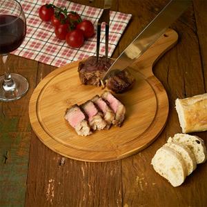 Descrição: Tábua de bambu média com canaleta e cabo. Largura 24,2 cm Medidas aproximadas para gravação(CxL): 19 cm X 19 cm Peso aproximado(g): 328 Comprimento 36,1 cm Espessura 0,8 cm