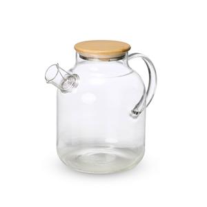Descrição: Chaleira em vidro borossilicato e capacidade máxima de 1,8 litro. Suporta variações de temperatura, pode ser levada a fogo baixo. Possui tampa em bambu com vedação para conservar a temperatura dos líquidos por mais tempo. Acompanha filtro de bico em alumínio. Largura 21 cm Medidas aproximadas para gravação(CxL): 14 cm x 12 cm Peso aproximado(g): 406 Circunferência 43,8 cm Altura 18,5 cm